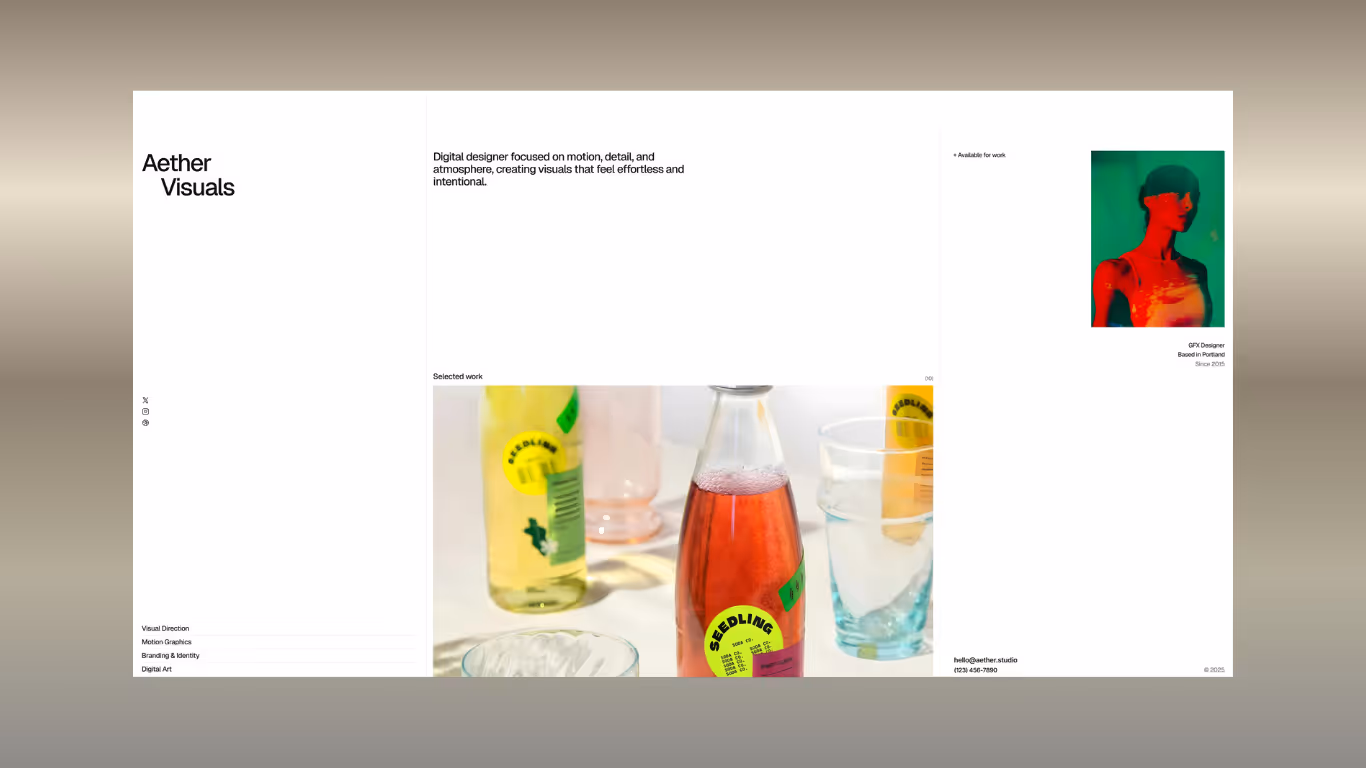 Aether blends art direction, motion, and visual design into cohesive digital atmospheres. Every frame is crafted to feel intentional — effortless, balanced, and distinctly human.