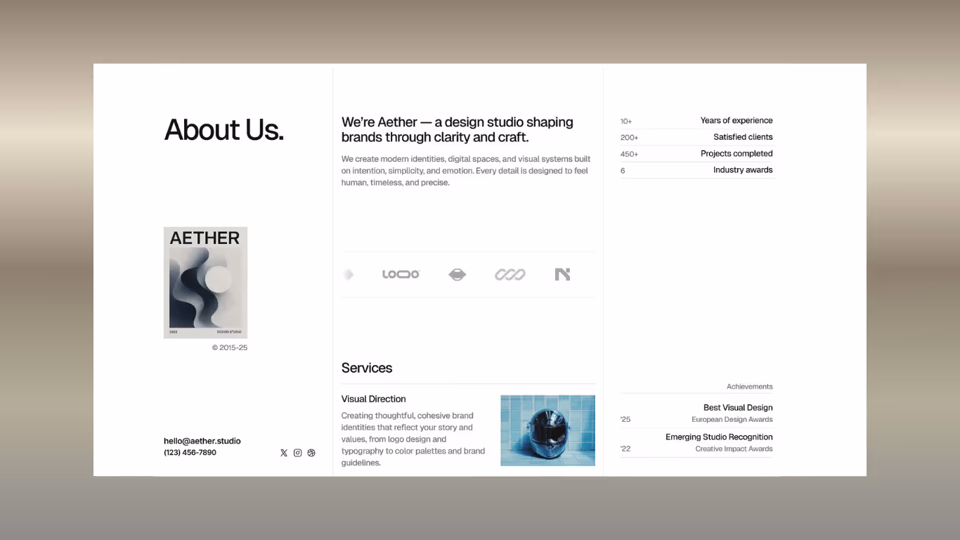 Aether’s visual system merges structure and warmth — blending editorial rhythm with digital precision. Each element, from typography to motion, is crafted to feel calm, balanced, and alive. The result: a brand identity that feels as human as it is refined.
